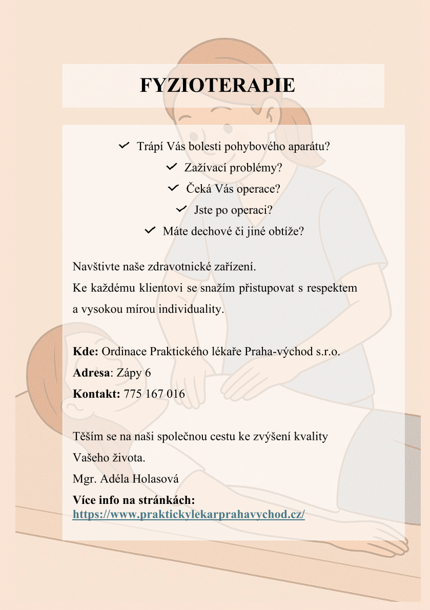Nově od září 2025 otvíráme ordinaci fyzioterapeuta. Od 22. září možnost objednání na tel.: 775 167 016. Veškeré informace naleznete na stránce Fyzioterapie.